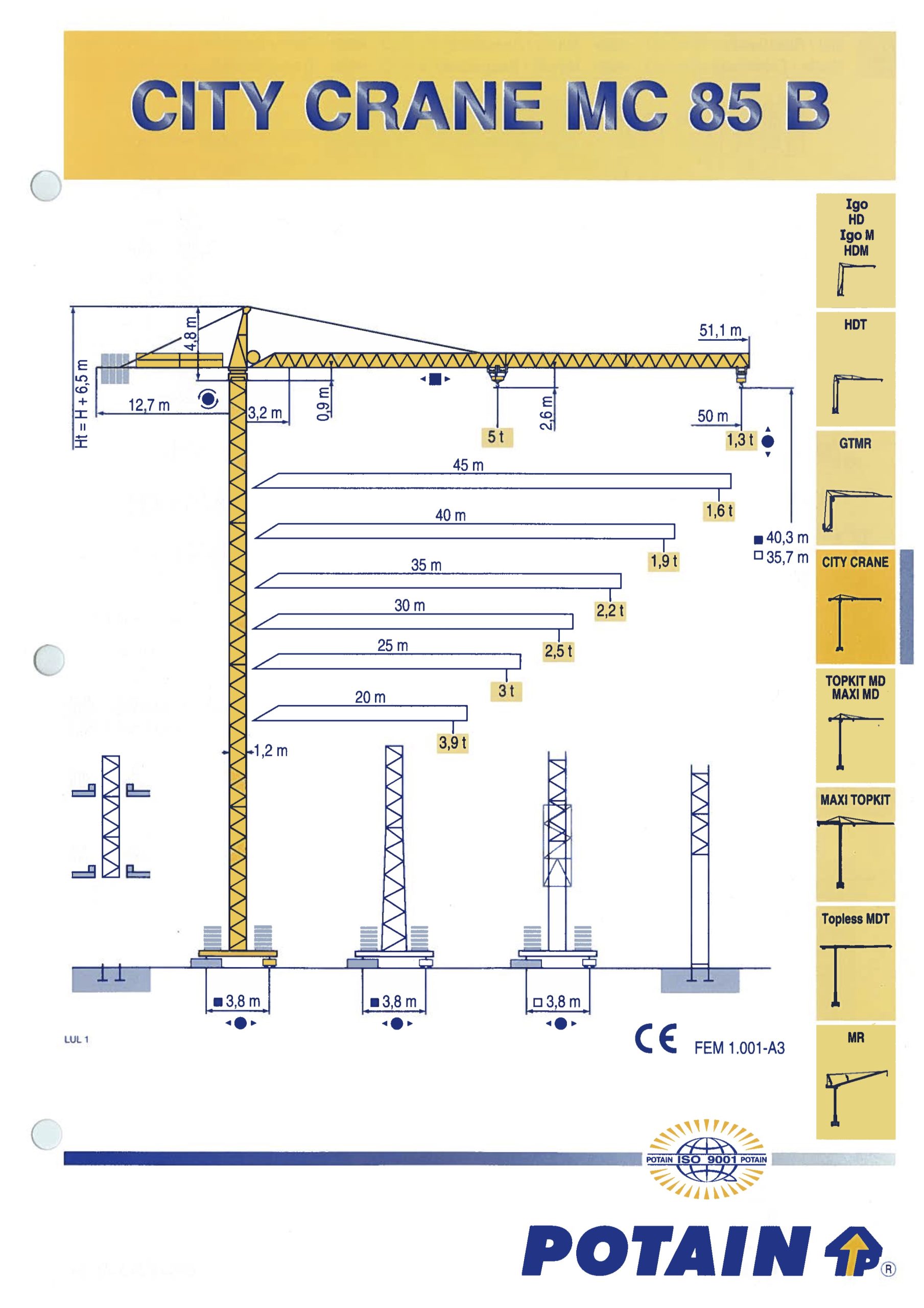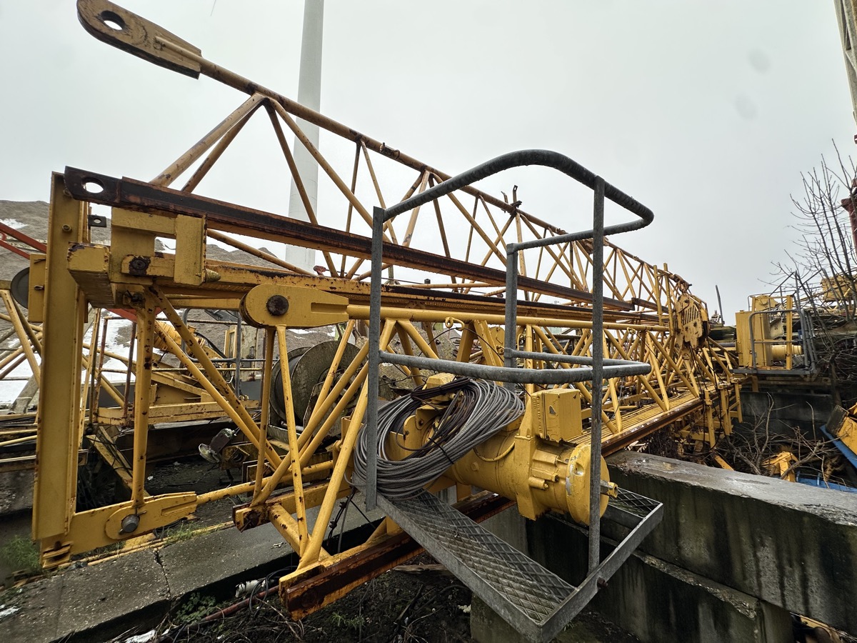 year 2002 – 50m jib (cap. 1300kg) – max. load: 5.000kg@15m – 2 trolleys – HUH +/- 38,8m – with ZC16A 3,8m x 3,8m cross base and ballast + 9,10m conical section 1,6m/1,2m + 2x 10,50m sections (1,2m) + 3x 3,00m sections (1,2m) – 25 PC 13 winch (35 kVA) – no cabin – with radio remote control